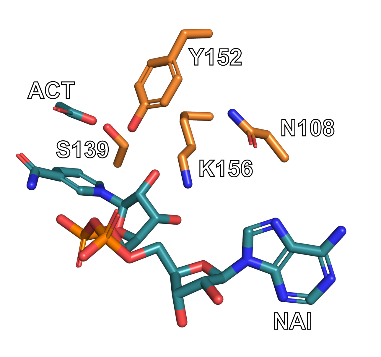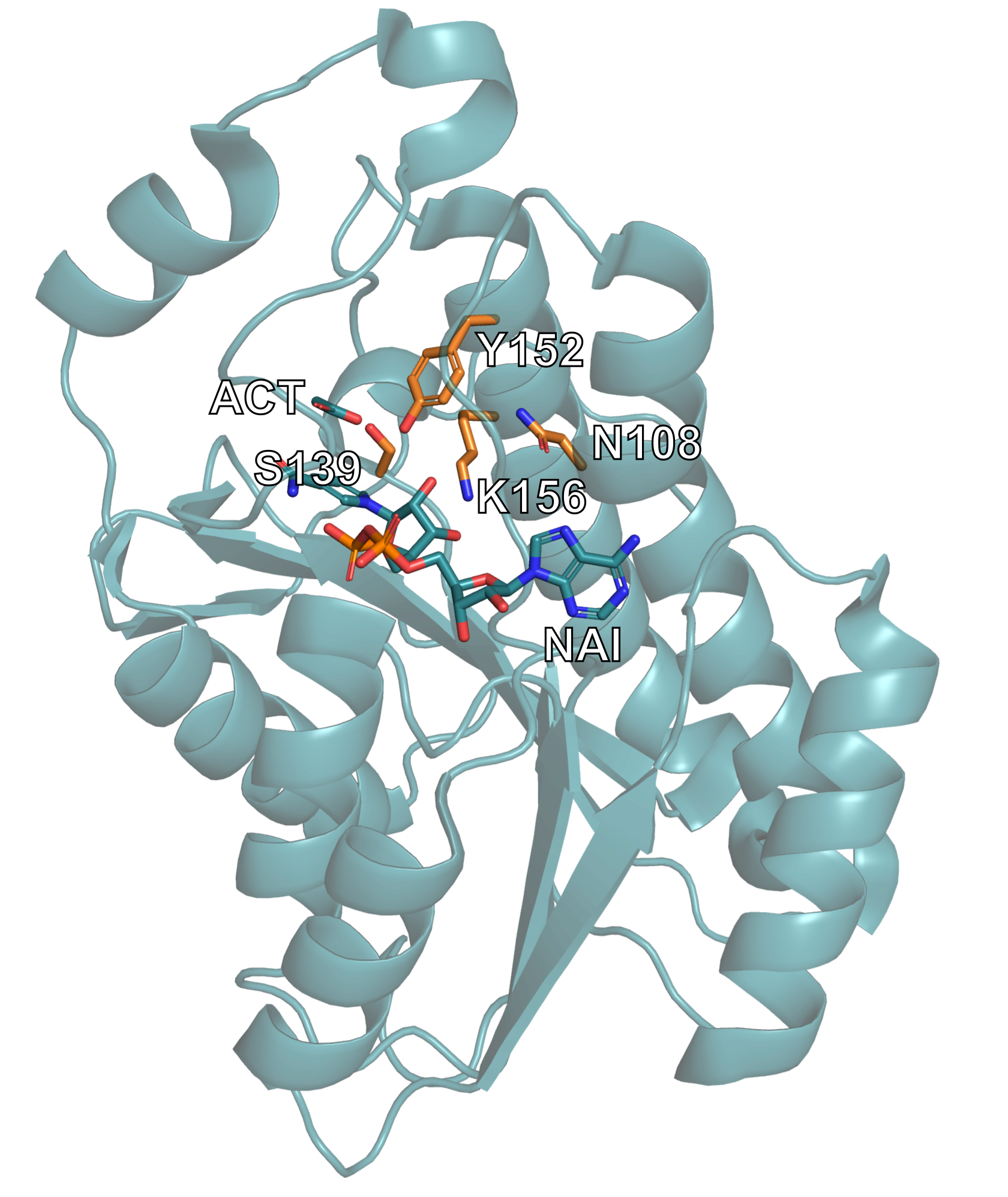 The catalytic triad is composed of Ser139, Tyr152, and Lys156. In addition, Asn108 is also crucial for catalysis, so we will focus on these residues for our design. You can find more information about the structure of the catalytic site in these two papers: